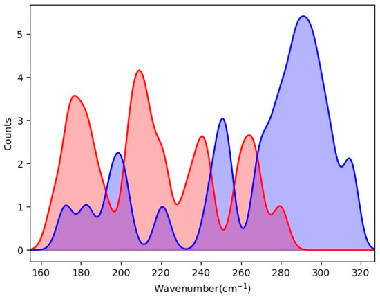 The distribution diagrams of four-bond modes (blue) and two-bond modes (red) of ice XVI in the range from 160 cm−1 to 320 cm−1. The standard classification of stretching modes in terms of the vibrational direction is applied.