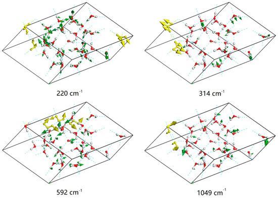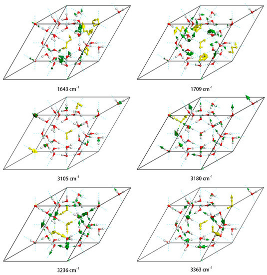 In the intramolecular O–H stretching region, each molecule has two kinds of vibration mode: symmetric stretching and asymmetric stretching. There are 68 normal modes in the stretching zone, with a range from 3105 cm−1 to 3368 cm−1. In Figure 5, four representative modes are selected, with the typical vibrations of the molecule shown in gold. To maintain a static center of mass, the vibrations of molecules are correlated in a crystal lattice. The minimum-energy mode at 3105 cm−1 is predominantly symmetric stretching with some coupled asymmetric stretching. Four peaks were detected by Raman scattering as shown in Figure 2. The minimum-energy peak is at 3180 cm−1 and is still mainly symmetric stretching. The highest-energy peak in the Raman spectrum in this region is at 3236 cm−1, in which most molecules undergo asymmetric stretching. The highest-energy peak of the entire Raman spectrum is at 3363 cm−1, in which almost all of the vibrations are asymmetric. The increasing trend of vibrational energies in this region from symmetric to asymmetric stretching is consistent with the literature [28]. Owing to selection rules, the IR absorptions are mostly symmetric stretching. In Figure 5, one can see that the highest-intensity peak of IR is at around 3180 cm−1.