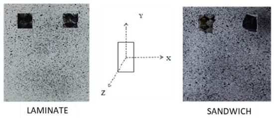 In this study, two diverse types of CFRP were analyzed. The first is a laminate made by multi-plies epoxy resin reinforced by carbon fibers. The second is a sandwich constituted by a foam included in two skins of CFRP. In both cases the specimens were tested under uniaxial compression conditions, according to the CAI Test (ASTM 7137) [22]. According to the standard, the width and the height of both the materials’ specimens were 150 mm × 100 mm, while the thicknesses were, respectively, 5 mm for the laminates and 3 mm for the foams.