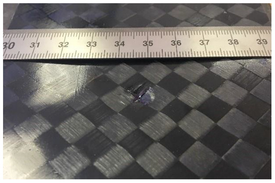 According to the standard [22], the specimens used for that kind of test were previously subjected to drop-weight impact per Test Method D7136 [23] prior to application of compressive force. As prescribed by the standard, the specimen was placed on a fixture base and aligned with the dropping axis by using guiding pins. Once finished, the alignment operations the specimen was clamped by four rubber terminated toggles. Velocity of the impactor was determined by optical sensors (manufacturer, city, country) placed along the dropping axis to determine accurately the impact energy. Experiments were led at room temperature at two levels of energy, respectively, 50 J for CFRP and 10 J for foams. Impact was obtained by a hemispherical impactor (manufacturer, city, country) having 16 mm of diameter, as prescribed by the standard. The rebound catcher system was activated during the test to avoid rebound of the impactor on the tested sample. These drop tests are most used in the aeronautic field for simulating the impact of a structure with birds. With the new composite materials, this aspect is of great interest for industry in order to evaluate the delamination effects occurring. Moreover, they generate a damage on the specimens whose shape and dimensions depend on the energy level of the test, as well as on the structural lay-up of the materials. According to the producer’s requirements, the above indicated energy levels set for the two materials were selected, after preliminary tests, to ensure a Barely Visible Impact Damage (BVID) of about 1 mm in depth (Figure 5). The extension of the damaged area was 1 cm for both the analyzed class of materials. The BVID is the name given to damage in a composite material caused by a low-velocity impact from objects. Low-velocity impacts cause only minor damage to the surface of the composite, which is generally not readily detectable by visual inspection, hence the term BVID. However, they can cause structurally considerable damage internally within laminate composites, such as delamination, matrix cracking, fiber fracture, and fiber pullout. The aim of the CAI tests was to evaluate the compression residual strength properties of CFRP.