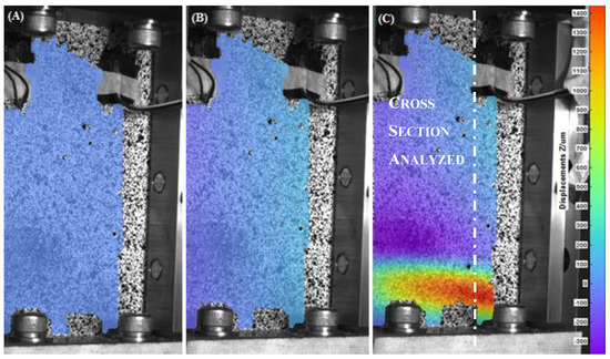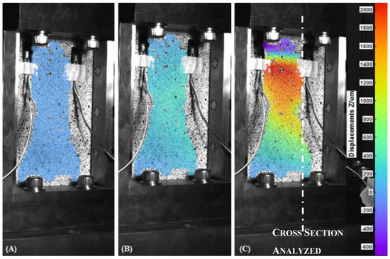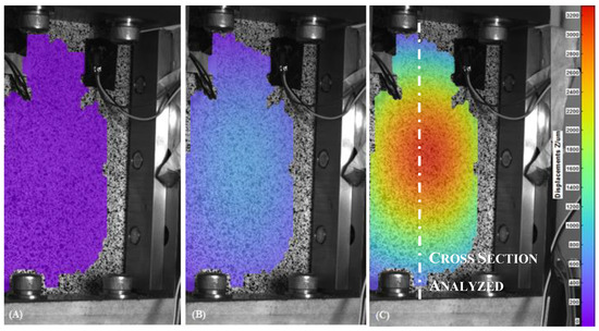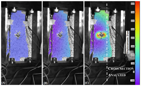 Out-of-plane displacement of the undamaged Carbon Fiber Reinforced Plastics (CFRP) recorded by DIC at t = 0 s (A), t = 80 s (B) and t = 116 s (C).
