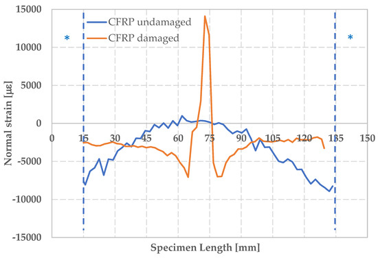 The longitudinal deformation εyy along the median cross section of the CFRP specimens is shown in Figure 11, under conditions of maximum deformation. Cross-section was chosen in order to avoid regions where no correlation was observed as shown in Figure 7. The * indicates areas with no information due to the impossibility of recognizing speckle pattern by the DIC system. The lack of information is caused by the shadow zones created by the fixture.