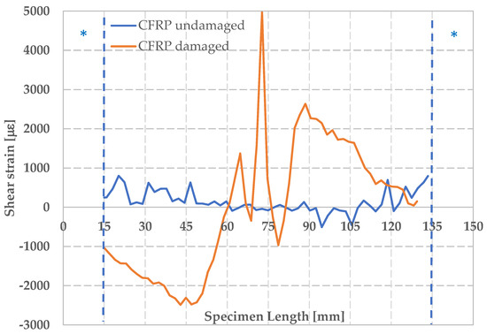 In Figure 12, the maximum shear strain for damaged and undamaged CFRPs is also reported. No points of maximum shear strain concentration, along the analyzed cross-sections, are observable for the undamaged CFRPs. For the damaged CFRPs, instead, a very different behavior is observed with a clearly evident maximum at the center of the component with a positive strain of 5000 μm. Rupture of the component occurs in correspondence of the area of maximum shear strain. A symmetric behavior in the lower part of the sample with respect to the upper part is observed, indicating the presence of a relative rotation of the two parts during the test.