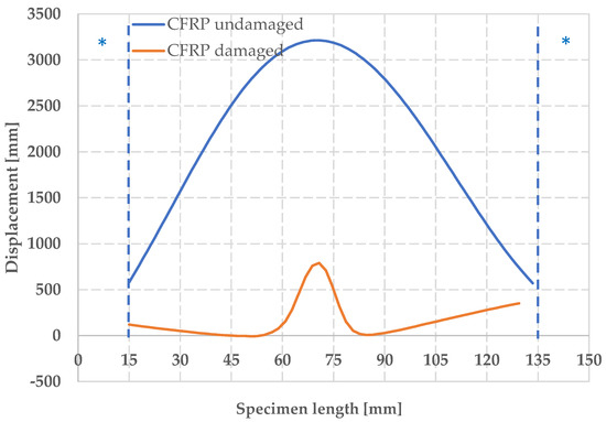 Out-of-plane displacement w for damaged and undamaged CFRP.