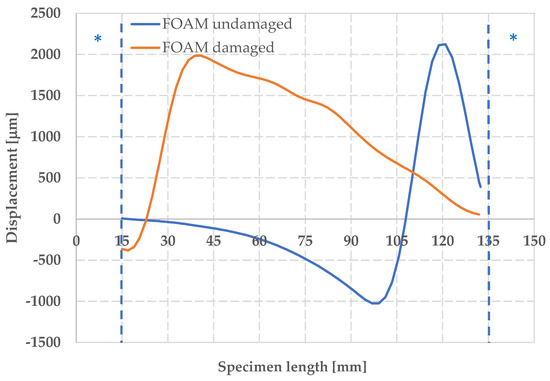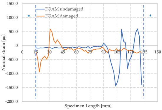 In Figure 14, the trend of longitudinal deformation along the cross-section for the foam specimens is reported under conditions of maximum longitudinal deformation. The maximum values of εyy along the median cross section are, respectively, −8000 με for the undamaged foam and −9700 με for the impacted foam. The correspondent mean values of maximum load are −6618 ± 206 N and −4178 ± 413 N, respectively, while the mean values of maximum CAI stress are −84 ± 3 MPa and −53 ± 5 MPa, respectively.