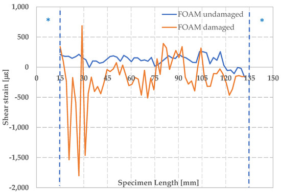 In Figure 15, the maximum shear strain recorded under conditions of maximum deformation is shown. It can be observed that the shear strain, for the undamaged foam, is quite uniform along the plotted cross section. In the case of damaged foam, we can observe points of shear strain concentration along the analyzed cross section; in particular high negative values of shear strain are recorded in correspondence of the upper part of the component reaching a minimum value of γxy of −1800 μm, that corresponds to the region where skin instability occurs.