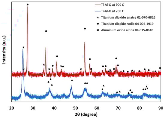 Nanofibers were prepared using a single nozzle ES system with composition shown in Table 1. All the fiber components are uniformly distributed in the ES precursor solution (II-IV), as well as in the dried fibers prior to thermal treatment, as shown in Figure 1a. At a low PVP content (Solution I), few scattered beads are formed (Figure 1b) []. Further decrease of the PVP content resulted in an unspinnable precursor. Before thermal treatment, the fibers had a bimodal distribution consisting of fibers with a large diameter of 600–1000 nm (average 672 nm, ±206 nm) and fibers with a smaller diameter in the 100–170 nm range (average 138 nm, ±22 nm). The dried ‘green’ fibers were heated in a multi-step heating profile up to 700 °C (Figure S1). Different final morphologies were obtained by varying the PVP content relative to the other precursor components (Figure 2). As expected, the fibers diameter shrunk to less than half the initial (green) diameter during thermal treatment, so after heating they had a bimodal distribution consisting of fibers with a large diameter, i.e., 200–400 nm (average 292 nm, ±30 nm), and fibers with a smaller diameter, i.e., in the 40–80 nm range (average 63 nm, ±13 nm). Thus, after thermal treatment, a 55% shrinkage in diameter was observed. This shrinkage is consistent with earlier findings in our work with other ceramic-polymer systems [,]. The lamellar-like pores appear after sintering in solution I and II. Single point BET calculations showed that the surface area of lamellar-like structure was in the range of 150–170 m2∙gr−1. The pore size in the fibers obtained by BJH method was 4–5 nm. Increasing the PVP composition (Solution II) resulted in stable ES operation without the formation of beads. After sintering, the fibers display lamellar like pores (Figure 2b). Increasing the polymer content further (Solution III) results in the formation pores but with different structures (Figure 2c). Since the PVP content is increased relative to the ceramic precursor (Ti- and Al-based components), the segregation or phase separation during the thermal treatment is less significant, and only small separated inclusions of liquid are formed. At high PVP content (Solution IV), the obtained fibers have a relatively smooth surface (Figure 2d). EDS was used to verify the content of Ti and Al in the fibers (Figure S2); the carbon signal is due to the presence of carbon tape as the sample adhesive layer. In addition, the X-ray diffraction (XRD) pattern only shows anatase titanium dioxide phase; the alumina phase is not observed (Figure 3). Therefore, either the aluminum oxide is amorphous or the crystalline alumina phase signals peaks are below the detection level. Increasing the final temperature from 700 °C to 900 °C results in the destruction of the lamellar-like structure (Figure 4) due to growth of the ceramic particles. As expected, at 900 °C, the TiO2 phase changed from anatase to rutile with TiO2 [], and the α-Al2O3 phase is also observed (Figure 3).