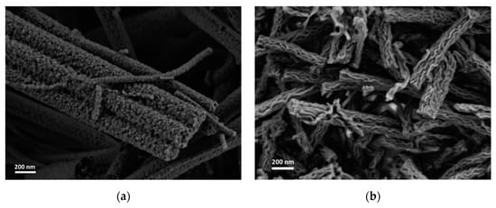 In agreement with the mechanism suggested earlier for the formation of lamellar-like nanofibers, the presence of an aluminum-organic component with a low melting point and high volatility facilitated the structure formation []. Therefore, pure TiO2 with the same PVP-to-ceramic precursor ratio as that of solution II showed different morphology (Figure 5a). In contrast, a pure Al-based solution with the same PVP-to-ceramic precrusor ratio as that of solution II showed the same lamellar-like nanofiber morphology (Figure 5b).