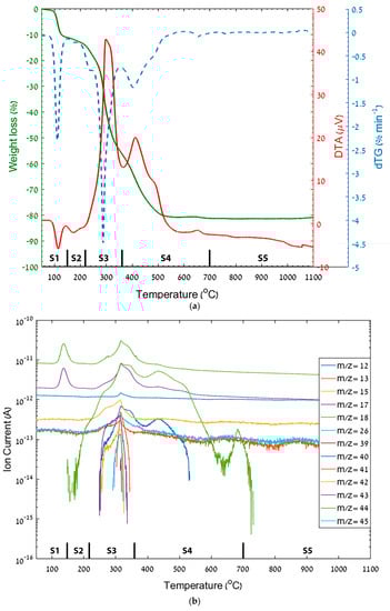 Thermal analysis with evolved gas analysis of Ti-Al-O nanofibrous mat. Vertical dashed lines represent a process stage (denoted as S1–S5). (a) TGA/DTA/DTG curves. (b) Evolved gases detected by MS.