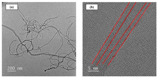 The matrix material employed in the present study was a two-part bisphenol A type epoxy (EPO-RT 90) supplied by Epotech Composite Corporation, Taichung, Taiwan. The mixing ratio between the epoxy resin and the hardener is 100:35. Applied Nanotechnologies, Inc., Chapel Hill, North Carolina, USA, provided the MWCNTs utilized. The purity of the studied MWCNTs is larger than 95%. Figure 1a,b shows the transmission electron microscopy (TEM, JEM-ARM200FTH, JEOL Ltd., Tokyo, Japan) images of the as-received MWCNTs taken at different magnifications. It is seen from Figure 1a that the length and the diameter of the employed MWCNT are approximately 2 μm and 10 nm, respectively. The magnified image of Figure 1b displays the six-layered wall structure of the as-received MWCNTs.