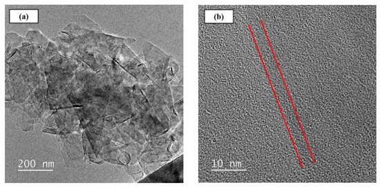The GNPs with the designation of KNG-150 were supplied by Xiamen Knano Graphene Technology Corporation (Xiamen, China). The purity of the studied GNPs is larger than 99.5% and the specific surface area is around 40 to 60 m2/g. Figure 2 shows the TEM images of employed GNPs. Figure 2a shows that the average areal size of the as-received GNP is around 200 nm × 200 nm. The enlarged image as shown in Figure 2b displays that the GNP is characterized with the 10-layer sheet structure, and the lateral size of the studied GNPs is 3 nm.