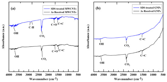 Figure 3a,b shows the FT-IR spectra of the employed MWCNTs and GNPs, respectively. In each figure, the spectra of as-received and SDS-treated fillers are depicted together to examine the results of treatment. As shown in Figure 3a, the –OH, –C=O, and –C=C peaks were observed both for the as-received and SDS-treated MWCNT spectra. The peaks mentioned above for the SDS treated MWCNT spectrum shows slightly stronger than that of as-received MWCNT, and tiny C–H peaks are found in the SDS treated MWCNT spectrum. Figure 3b shows only –OH and –C=O peaks presented and no obvious difference was found between the spectra of the SDS treated and as-received GNPs. The results shown in Figure 3a,b indicates that the SDS treatment has negligible effects on the fabrication of beneficial functional groups on the surfaces of nano-fillers for the formation of crosslink with the polymer matrix.