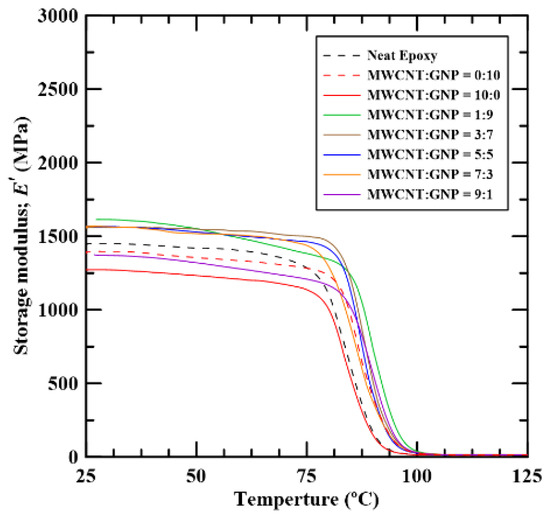 Temperature dependence of the storage modulus E′ of the epoxy composites with various MWCNT:GNP ratios.