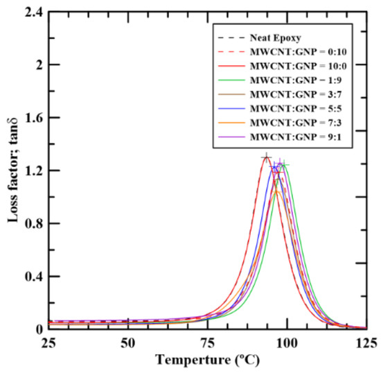 Figure 5 and Figure 6 show the thermomechanical results experimentally obtained using DMA. It is noted that the curves shown in Figure 5 and Figure 6 obtained from three repeated tests for each type of specimen almost converge together, which indicates that the repeatability of the DMA test is verified. The curves shown in Figure 5 and Figure 6 select the ones where the obtained glass transition temperature is closest to the average value among the three identical DMA tests for the same type of specimens. Figure 5 depicts the temperature dependence of storage modulus E′ of the studied nanocomposites with different MWNT/GNT ratios. It shows that, in the glassy region, the composites with single carbon nano-filler decrease the storage moduli of the neat epoxy. However, the employment of hybrid fillers in the epoxy improves the storage moduli significantly except for the specimens with the MWCNT:GNP ratio of 9:1. The hybrid composites with the MWCNT:GNP ratio of 1:9 display the best synergistic effect on the thermomechanical properties for the corresponding values of the storage moduli, which are higher than those with other filler ratios. The improvement results from the uniform distribution and the high aspect ratio of MWCNTs. The addition of a small amount of GNPs provides more linkage in the matrix. Surveying past literature reveals that the synergistic effect of the MWCNT/GNP hybrid fillers on the thermomechanical properties of epoxy composites is scarcely studied. The optimal filler ratios obtained by a few investigations on the room-temperature mechanical properties of the MWCNT/GNP/epoxy composites are diverse [7,10,16,21]. Among these studies, the drastic (1:9 or 9:1) and equal (5:5) ratios are frequently reported. Yang et al. [16] found the epoxy composites with the MWCNT:GNP ratio of 1:9, which have higher tensile modulus and strength than those with other filler ratios. The greater contact surface between two fillers under the specific ratio is considered the main mechanism of reinforcement.