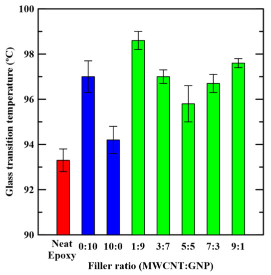 Figure 6 shows the temperature-dependent loss factor tan δ curves of the studied nanocomposites with various filler ratios. It shows that peaks of loss factor curves decrease with the addition of carbon nano-fillers in the pristine epoxy. Moreover, the loss factor curves tend to shift to the right when the epoxy specimens are added with the nano-fillers. The trend to the left of the loss factor curves for the hybrid nanocomposites with appropriate filler ratios is stronger than those with single filler. In Table 1, it is reported, for all samples analyzed, the glass transition temperature, Tg obtained from the temperature of maximum peak of Figure 6. As shown in Figure 6, these peaks are marked by the cross symbols. Figure 7 shows obtained glass transition temperatures of the studied nanocomposites. The figure shows that glass transition temperatures of the nanocomposites with single carbon nano-filler are higher than that of the neat epoxy. Moreover, the hybrid nanocomposites with appropriate filler ratios can further increase the glass transition temperatures. The studied composites with the MWCNT:GNP ratio of 1:9 have the highest glass transition temperatures, which implies that the most significant synergistic effect on the thermomechanical properties of GNP-epoxy composites can be obtained by replacing a small amount of nano-fillers with MWCNTs. The network constituted by two different types of carbon nano-fillers with high stiffness and strength can expand the temperature region of glassy states of the studied nanocomposites effectively.