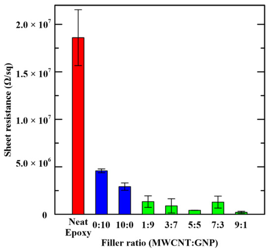 Table 1 lists the measured sheet resistance of the studied nanocomposites. The results are also depicted in Figure 8. The data of pristine epoxy are also shown in the figure for comparison. It is evident that adding single carbon nano-filler can reduce the electrical resistance significantly. The values of obtained sheet resistance for the MWCNT-epoxy and GNP-epoxy composites were six and four times lower than that of the neat epoxy, respectively. Furthermore, the employment of hybrid fillers in the epoxy matrix future lowers the sheet resistance when compared with that of single filler composites. The resistance of the pristine epoxy decreased several times when the hybrid fillers were added in the matrix. The network composed by two geometrically different carbon nano-fillers effectively enhances the conductive properties. Among the studied composites with two types of fillers, the composites with the MWCNT:GNP ratio of 9:1 displayed the lowest resistance. The sheet-like structure of GNPs can increase the contact area between each other while the electrical conductivity of the studied nanocomposites is increased. The addition of a small amount of MWCNTs can constitute bridges between GNPs, and can prevent the agglomeration of GNPs to enhance the dispersibility of GNPs. The optimal MWCNT:GNP filler ratio for the electrical conductivity of epoxy composites was seldom studied before. The MWCNT:GNP ratios employed in the specimen preparation of References [10,13] were controlled at 1:1. He et al. [13] prepared the MWCNT/GNP/epoxy composite specimens with different filler ratio to study the synergistic effect of the hybrid fillers on the electrical conductivity. The composites with more GNPs were found to have higher conductivity. However, the high loading of 10 wt % was designated for the total content of two fillers in the specimen fabrication.