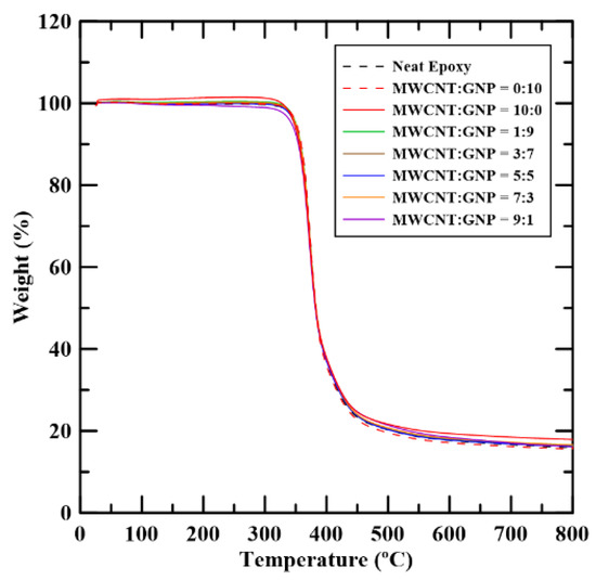 Figure 9 shows the weight loss curves of the studied nanocomposites with different filler ratios obtained using TGA. The curve depicted here is the one where the corresponding pyrolysis temperature is closest to the average value obtained from the five identical TGA tests for the same type of specimens. It shows that these weight loss curves of the fabricated samples with various filler ratio are almost overlapping. This implies that the effects of filler ratios and the number of filler types are tiny on the thermogravimetric properties. The pyrolysis temperature of the studied sample Td was obtained from the curve since the temperature corresponded to 10% weight loss. The observed pyrolysis temperatures of the specimens with various filler ratios are listed in Table 1. Figure 10 shows the pyrolysis temperatures of the studied nanocomposites with various filler ratios. It is evident that adding carbon nano-fillers can increase the pyrolysis temperatures of the neat epoxy by 5 to 8 °C. However, the difference of the pyrolysis temperatures between the nanocomposites with single and hybrid filler systems is minor, which indicates that the synergistic effect of two types of carbon nano-fillers on the thermal decomposition properties is not noticeable.