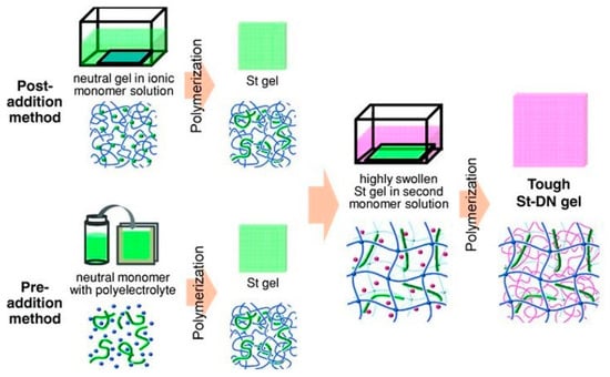 - Nakajima, T.; Sato, H.; Zhao, Y.; Kawahara, S.; Kurokawa, T.; Sugahara, K.; Gong, J.P. A Universal Molecular Stent Method to Toughen any Hydrogels Based on Double Network Concept. Adv. Funct. Mater. 2012, 22, 4426–4432. [Google Scholar] [CrossRef]