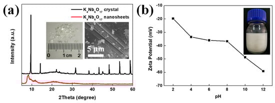 (a) X-ray diffractometer (XRD) spectra of K4Nb6O17 crystal and K4Nb6O17 nanosheets. Inset was the optical photograph (left) and SEM image (right) of K4Nb6O17 crystal. (b) Zeta potential of K4Nb6O17 nanosheets dispersion. Inset was the single to few-layer dispersion in water (60 mg mL−1).