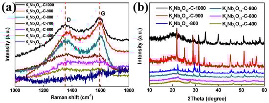 (a) Raman spectra of K4Nb6O17-C-800. (b) XRD patterns of K4Nb6O17-C.