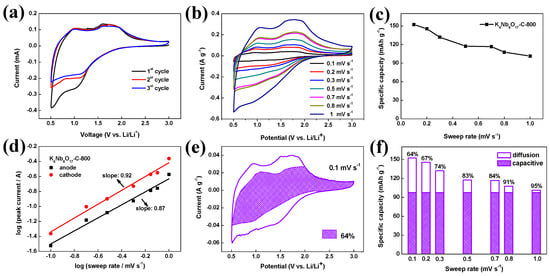 To investigate the electrochemical performances of lithium ions insertion/extraction, as-prepared K4Nb6O17-C-800 was measured using representative CV curves for the initial three cycles in the range of 0.5–3.0 V at 0.5 mV s−1. As we can see in Figure 5a, the oxidation peaks at about 1.00 and 1.75 V vs. Li+/Li were observed when the first oxidation process (Li+ extraction) and the reduction peak at approximately 1.21 V vs. Li+/Li was shown in the first reduction process (Li+ insertion). The following CV curves demonstrated quite good repeatability. As shown in Figure 5b, CV measurements at scan rates of 0.1 to 1 mV s−1 were used to explore the electrochemical characteristics of K4Nb6O17-C-800 electrode. There are a series of redox broad peaks, indicating that the Li+ insertion/extraction into/from K4Nb6O17-C-800 is a highly reversible process. The current peaks of cathodic and anodic shift noteworthily with the increase in scan speed, which may be attributed to the ohmic contributions of diffusion control process. The capacity of K4Nb6O17-C-800 is calculated via integrating the discharge process of CV, especially, the specific capacitance of K4Nb6O17-C-800 was 102 mA h g−1 at 1 mV s−1 (Figure 5c), showing a high-rate storage capability, which can be attributed to the high ionic conductivity and amorphous carbon coated layer structure of K4Nb6O17-C-800 nanosheets. Due to the special behavior of K4Nb6O17-C-800 nanosheets, the currents are in direct accordance with the scan rates in the CV tests, obeying the power law [,] (, where k and b both variable coefficients, i and v are current (A), and scan rate (mV s−1), respectively). The parameter b varies between 0.5 and 1, and the values of 0.5 and 1 are represented the diffusion-limited process (charge by Li+ insertion, battery-style) and the capacitive process (charge by surface capacitive effects, supercapacitor-style), respectively. As we can see in Figure 5d, the b value was 1 for the current peaks of cathodic and anodic at 0.1–1 mV s−1, manifesting a fast Li+ insertion process with a representative capacitive behavior. To differentiate quantitatively the effect of capacitance to the current response via the scan rate [], we can use the formula, as follows: