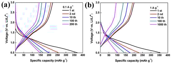 The charge/discharge profile of K4Nb6O17-C-800 with the current density of (a) 0.1 and (b) 1 A g−1 at ambient temperature.