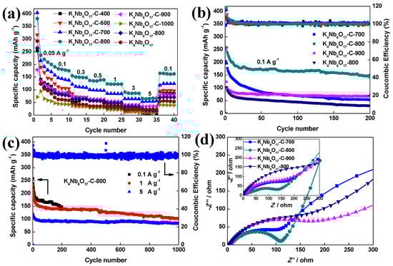 (a) Comparison of the capacities in dependence of cycle number of K4Nb6O17-C-800 half-cells at various current densities from 0.05 to 5 A g−1. (b) The cycling stability of samples at a current density of 0.1 A g−1. (c) The cycling stability of K4Nb6O17-C-800 at a current density of 0.1, 1, and 5 A g−1. (d) Nyquist plots of half-cell of the synthesis of K4Nb6O17-C nanosheet. The inset shows that the Nyquist plots of K4Nb6O17-C sample after 200 cycles with a current density of 0.1 A g−1.