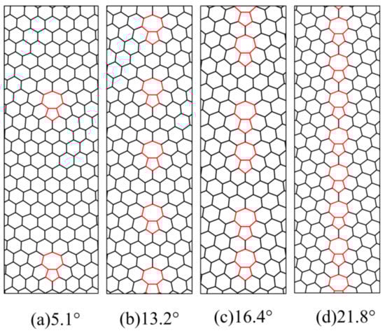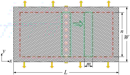 Zigzag-oriented GB models with different misorientation angles were constructed using molecular structure mechanics and the theory of crystal disclinations, as shown in Figure 2. A detailed definition of the misorientation angle can be found in reference [15]. The GB is composed of pentagon–heptagon ring defects, and the chosen misorientation angles were 5.1°, 13.2°, 16.4°, and 21.8°. A graphene model (as shown in Figure 3) containing a zigzag-oriented GB was fabricated to investigate the initial fracture site of graphene; its size was L × W = 17 nm × 9 nm, where L and W denote the length and width of the graphene. The misorientation angles of the GB were 5.1°, 13.2°, 16.4°, and 21.8°. The values of strain energy per unit area of the different graphene nanoribbons were calculated for the area shown in the green solid line frame of Figure 3. In the process of simulations, the green solid line frame of size n × m = 8 nm × 0.88 nm gradually moves away from the GB. In addition, the movable area of the green solid line frame is confined within the red dotted frame so as to avoid the boundary effect of the graphene. Two types of boundary conditions were adopted for the model in Figure 3. One is that the left and right edges are subjected to opposite displacement load along the x direction, and the y direction at the middle of the left and right edges is constrained, while the top and bottom edges are free; the other is that the top and bottom edges are subjected to the opposite displacement load along the y direction, and the x direction at the middle of the top and bottom edges is constrained, while the left and right edges are free, as shown in Figure 3.