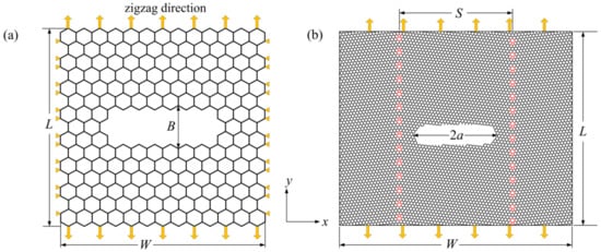 Monocrystalline/polycrystalline graphene models containing a central crack (perpendicular to the load direction) were created to study the influence of GB on the mode I fracture toughness as shown in Figure 4a,b, where Figure 4a is the zigzag-oriented monocrystalline graphene model and Figure 4b is the square polycrystalline graphene model with two antisymmetric zigzag-oriented GBs. The distance between the two antisymmetric GBs and the crack length and width are represented by S, 2a, and B, respectively. For convenience, the ratio of crack length to graphene width was defined as the crack proportion f. In order to simulate the process by which the crack tip gradually expands to the GB, the crack length is kept constant and the distance between the two GBs is gradually reduced. The influence factors can be simplified by this means. The distances between the crack tip and GB were 0.33 nm, 0.6 nm, 0.8 nm, and 1.1 nm. The size of the specimen has a significant influence on the fracture toughness [32]. In this paper, the main object was to study the effect of GBs on the fracture toughness. The size of the polycrystalline graphene model was considered to be constant. In the process of simulation, the misorientation angles of the two antisymmetric GBs were 5.1°, 13.2°, 16.4°, and 21.8°. The same boundary condition was imposed on the two types of graphene models. The top and bottom edges were subjected to opposite displacement load along the y direction, while the x directions of the left and right edges were constrained, as shown in Figure 4.