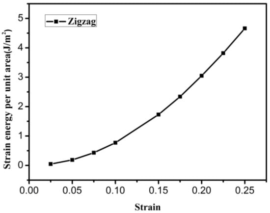 In this section, the initial fracture site of graphene is explored. The strain energy per unit area of pristine zigzag graphene was obtained via Equation (12). Figure 5 shows the variation in the strain energy per unit area of pristine graphene with increasing strain. The strain energy per unit area increases with increasing strain, and it will have a maximum value when the strain of the pristine graphene reaches the failure strain. The strain and strain energy per unit area were 24.6% and 4.66 J/m2, respectively. The results of this paper are in good agreement with those in the literature [33].