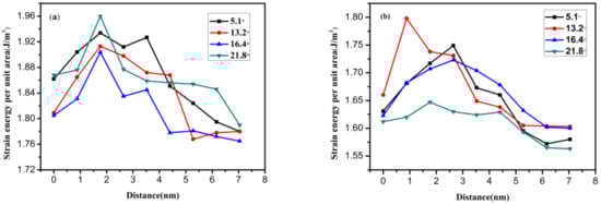 The strain energy per unit area of different graphene nanoribbons was investigated through the model in Figure 3, and then the initial fracture site of the polycrystalline graphene was analyzed. The variation in strain energy per unit area with increasing distance from the GB for different load directions (perpendicular and parallel directions to GB) is illustrated in Figure 6a,b, where the strain of polycrystalline graphene was maintained at 15%. It can be seen from these figures that the strain energy per unit area exhibits an increasing–decreasing trend with the increasing distance from the GB. These curves show that the highest strain energy per unit area is not in the position of the GB but appears in the vicinity of the GB (at a distance of about 2 nm). Furthermore, it can be inferred from these figures that when the distance from the GB is far enough, the strain energy per unit area will reduce to that of pristine graphene. The initial fracture site of polycrystalline graphene appears in the vicinity of the GB. The influence of the GB on the surrounding monocrystalline region will gradually weaken as the distance from the GB increases. This effect can be neglected when the distance is large enough.