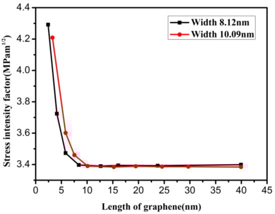 The size-dependent mode I critical stress intensity factor (SIF) was studied using the model in Figure 4a. Figure 7 shows the variation in the mode I critical SIF with increasing graphene length when the graphene width (the loaded edge) is fixed and the crack proportion is f = 0.3. It can be seen from this figure that the mode I critical SIFs of the two different graphene models have similar variation tendencies. When the graphene length is smaller than the width, the mode I critical SIF decreases sharply as the graphene length increases. However, the mode I critical SIF hardly changes with increasing graphene length when the graphene length is larger than the width. Moreover, it is interesting that the turning point in the variation trend of mode I critical SIF can be obtained when the graphene length is equal to the width. Thus, it can be inferred that there is a size effect of mode I fracture toughness, and the graphene length has little influence on the mode I critical SIF when the graphene length is larger than the width.