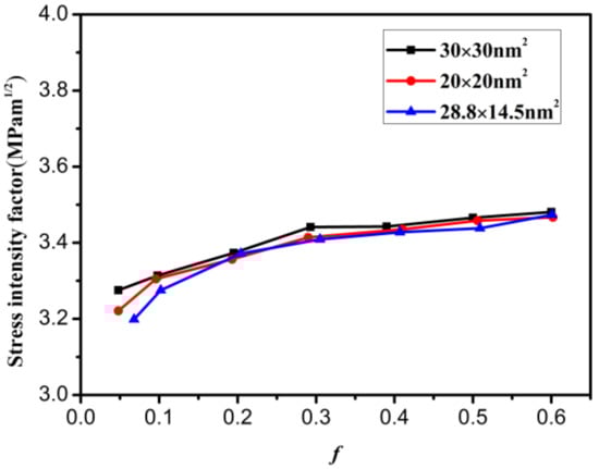Two types of graphene models were created to study the effect of crack proportion f on the mode I critical SIF, as shown in Figure 4a. One type is a square model; the other is a rectangular model (length is larger than width). The area of the rectangular model is 400 nm2 and those of the square models are 400 nm2 and 900 nm2. The variation in the mode I critical SIF with increasing crack proportion f is shown in Figure 8. It can be seen from this figure that as the crack proportion f increases, the mode I critical SIFs of the three graphene models first increase and then tend to stabilize. The sizes of the three mode I critical SIFs are basically the same. In addition, the curvilinear variation tendencies show that the mode I critical SIF of graphene almost becomes a constant value when the crack proportion f is between 0.2 and 0.6. The range of the SIF then is 3.4–3.5 MPam1/2. These results are consistent with those in the literature [34,35]. From the above analysis, it can be deduced that the SIF of graphene is hardly affected when the crack proportion f has a reasonable range (f = 0.2–0.6).