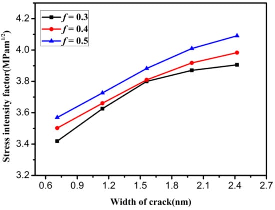 The effect of graphene width on the mode I critical SIF is also discussed in the graphene model (as shown in Figure 4a). The absolute length of the crack was increased as the graphene width increased to ensure that the crack proportion f was a constant value. Figure 9 shows the variation in the mode I critical SIF with increasing graphene width when the graphene model has length L = 30 nm and different crack proportions f. It can be seen that as the graphene width increases, two types of mode I critical SIF are almost a constant value. For a graphene model with a fixed width, the changes in the mode I critical SIFs can be neglected. The SIF in Figure 9 agrees with that in Figure 8. Furthermore, it can be inferred that the mode I critical SIF of graphene has a more stable trend when the absolute length of the crack is on the order of 10 nm. The minimum length of crack in this paper is consistent with that in the literature [29].