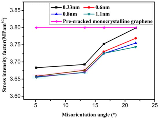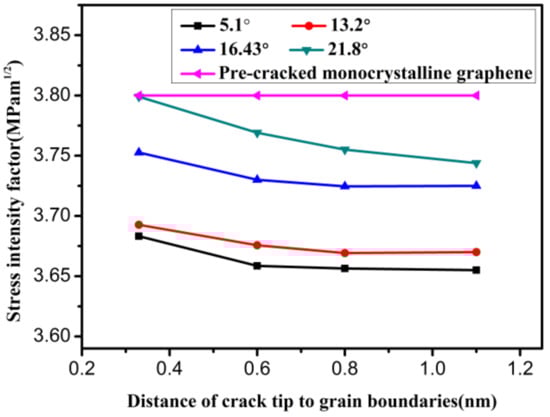 The model in Figure 4b was used to study the effect of GB on the mode I fracture toughness. Figure 11 exhibits the variation in mode I critical SIF with increasing distance between the crack tip and GB when the graphene model has different misorientation angles. It can be seen from the figure that the mode I fracture toughness of the pre-cracked polycrystalline graphene is less than that of pre-cracked pristine graphene due to the existence of a GB. As the distance between the crack tip and GB increases, the mode I critical SIF first decreases and then tends to stabilize. This is due to the GB having an effect on the surrounding monocrystalline region. Moreover, for polycrystalline graphene with different misorientation angles, the variation trend of the mode I critical SIF is different. When the misorientation angle is 21.8°, the variation trend of the mode I critical SIF is the most obvious, and the mode I critical SIF gradually reaches the level of that of the pre-cracked pristine graphene as the distance between the crack tip and GB decreases.