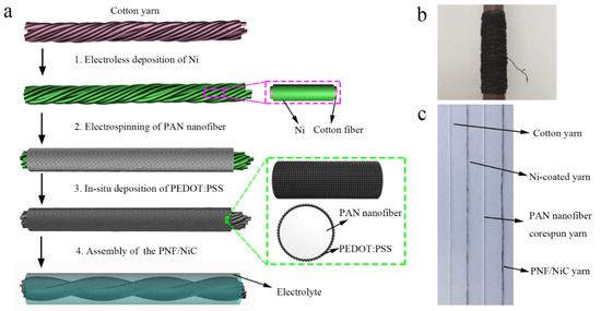 The fabrication process of the PNF/NiC capacitor yarn is shown in Figure 1a. Commercial cotton yarns were coated with a nickel layer by chemical polymerization to form conductive yarns, which can act as current collectors, and also maintain the flexibility of the textiles. In this study, a large number of high surface area PAN nanofibers prepared by electrospinning were wrapped on the core Ni-coated yarn to form PAN-nanofiber core-spun yarn (Figure S1, Supplementary Materials). PEDOT: PSS nanoparticles were deposited on PAN nanofibers by in situ polymerization, through which a PNF/NiC compound yarn was formed. The PNF/NiC yarns, which were used as the positive and negative electrodes, were soaked with the PVA/H3PO4 solution and allowed to solidify at room temperature. The resulting positive and negative electrode materials were twisted together to form a PNF/NiC capacitor yarn. This method can produce a large number of PAN nanofibers with a large specific surface area, and it can provide more channels for electrolyte penetration and ion transfer, thus improving the capacitance of the composite material. Figure 1b shows a photograph of a 500-m long Ni-coated cotton yarn that was wound on a spinning cone. Figure 1c is a photograph of cotton yarn, Ni-coated yarn, PAN nanofiber core-spun yarn and PNF/NiC yarn.