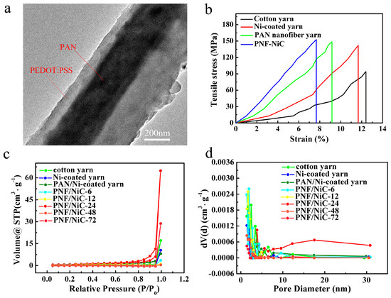 (a) TEM image of PNF/NiC-24. (b) Comparison of stress-strain curves of cotton yarn, nickel-coated cotton yarn, PAN nanofiber core-spun yarn, and PNF/NiC yarn. (c) Nitrogen adsorption isotherms and (d) Barrett-Joyner-Halenda pore size distribution curves of cotton and nickel-coated yarn, PAN nanofibers, and PNF/NiC compound cotton yarn at different processing times.