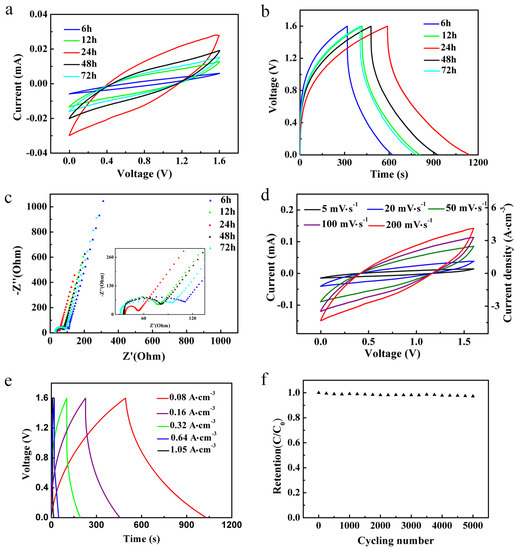 is the volumetric capacitance of the capacitor device in the two-electrode system, I refers to the discharge current, ∆t refers to the discharge time, refers to the effective active material volume of the single PNF/NiC composite electrode yarn, ∆U refers to the voltage window, and is the volumetric capacitance of a single PNF/NiC composite yarn. Figure 4b shows the galvanostatic charge-discharge curves of PNF/NiC SC at a current density of 0.08 A·cm−3; the capacitors with PEDOT: PSS were deposited at different times, and all exhibited a triangular shape. The volumetric capacitance values of PEDOT: PSS deposited at different times, which were calculated from the galvanostatic charge and discharge curves, are summarized in Supplementary Table S2. PNF/NiC yarn electrode with PEDOT: PSS deposited for 24 h in situ had the highest specific capacitance of 55.36 F·cm−3. This was consistent with the cyclic voltammetry data; further increasing the time for in situ deposition led to a decrease in the specific capacitance of the capacitor. This is due to the excessive deposition of PEDOT: PSS to form a dendritic [19,20] structure, which is formed by the aggregation of PEDOT: PSS nanoparticles.
