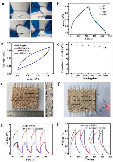 As mentioned before, our SC yarns, which are based on traditional cotton yarn processing, had good spinnability and mechanical properties, and the linear capacitors assembled with gel electrolytes were ideal yarns for wearable fabrics. Two woven capacitors composed of yarn and electrolyte were woven into fabric to verify the wearable stability. The PNF/NiC capacitor with in situ deposition of 24 h was used to test the bending properties at 0° (unbent) to 180° (folded), and the galvanostatic charge and discharge curves shown in Figure 5b indicate that the device that bends arbitrarily has little effect on the capacitive behavior. The SC yarn was bent for 3000 cycles to simulate a daily wearable condition. Over the entire bending test, the specific capacitance only decreased by 6%. Therefore, the wearable PNF/NiC capacitors had good fatigue durability, which was mainly attributed to the flexibility of the PNF/NiC electrode, and the penetration of the gel electrolyte played a role in protecting the original electrode.