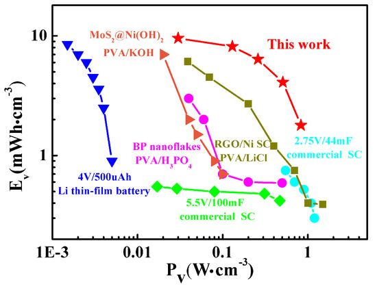 The power and energy densities of an electrochemical capacitor are important indicators for materials in practical applications. Herein, the energy density and power density of the developed SC yarns, some commercial capacitors, and supercapacitors reported recently in the literature were used for comparison. As shown in Figure 6, the SC yarn we made is in the upper right corner of the graph, and the maximum energy density was 9.56 mWh·cm−3, which is approximately 12 times a commercial 2.75 V/44 mF [40] capacitor, 17 times a commercial 5.5 V/100 mF [41] capacitor, and equivalent to a 4 V/500 μAh thin-film lithium battery [42,43]. The maximum energy density of the SC yarn was two times that of the black phosphorus nanoparticle paper-based all-solid-state supercapacitor [21], one times that of the MoS2@Ni(OH)2 [44], an all-solid-state supercapacitor, and two times that of the RGO/Ni-coated yarn-shaped capacitor [16]. The maximum power density of our constructed SC yarn was 830 mW·cm−3. Considering the above evidence, the constructed SC yarn was greater than other published data in energy density.