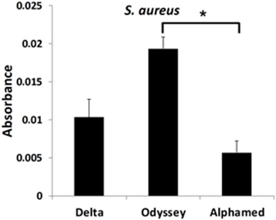 A ~3 fold statistically significant difference was detected in quantity of S. aureus between the OdysseyR and AlphamedR occluders. Although there was a higher trend (~2 fold) between the OdysseyR and DeltaR occluders the data was not statistically significant (Figure 2).