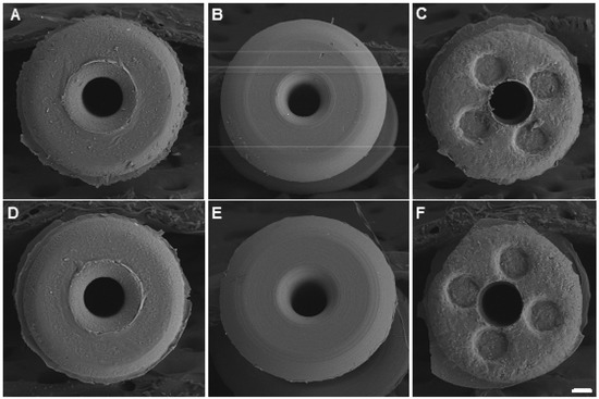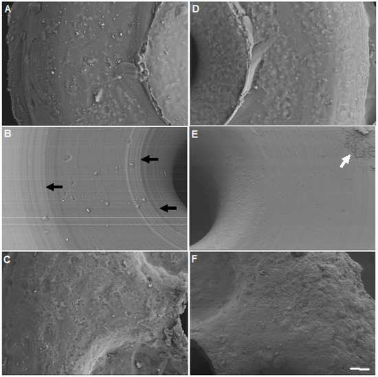Image analyses of occluders. The top surface of the three types of unused (control) and with seven days in the presence of S. aureus (experimental) occluders were imaged using scanning electron microscopy (SEM). (A) Control DeltaR; (B) Control OdysseyR; (C) Control AlphamedR; (D) Experimental DeltaR; (E) Experimental OdysseyR and (F) Experimental AlphamedR. Scale bar = 100 μm.