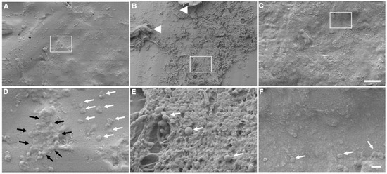 Higher magnification images, as shown in Figure 5, demonstrate the presence of individual bacteria in all three occluder types (Figure 5D–F, white arrows). The OdysseyR occluder contained the greatest amount and extent of colonization by S. aureus (Figure 5B,E), thus confirming our quantitative measurements shown in Figure 2. An extensive and thick three-dimensional (3D) biofilm formed on this occluder (Figure 5B, white arrow heads and white box), as shown in even larger magnification in Figure 5E, where the 3D structural features of the biofilm can be clearly seen. Smaller areas of biofilm were also detected on the DeltaR occluder (Figure 5A). One such small area is shown in Figure 5D within the white box, revealing the early formation of a biofilm, as indicated by the surrounding black arrows, but again, its structural formation is less to that observed with the OdysseyR occluder (Figure 5E). Moreover, the majority of bacteria were found in small clusters of two or three (Figure 5E, white arrows). Lastly, although bacteria were present on the AlphamedR occluder (Figure 5F, white arrows), there was no detectable biofilm formation, just individual cells (Figure 5C,F, white arrows).