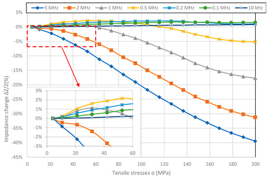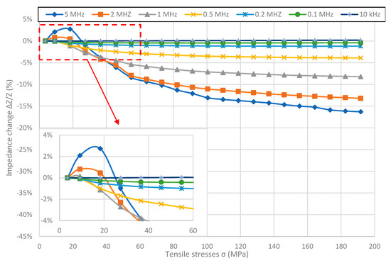 For the Fe40Ni38Mo4B18 sample (Figure 3), shape of the graph changes with the frequency. For frequencies below 1 MHz, graphs are hyperbolic like for Fe80B11Si9 ribbon. For 1 MHz and higher frequencies graphs aren’t monotonic and have pronounced reversal point. What is more, the stress value for which the inflection point occurs, increases with frequency, as can be seen more clearly at the inside of Figure 3. The maximal SI value was obtained for the 5 MHz frequency and was absolutely 16.30%, while the difference between the maximal and minimal impedance value was 19%. Similarly to Fe80B11Si9 samples, the SI effect for given stresses reaches saturation for frequencies below 1 MHz, and is close to saturation for higher frequencies.