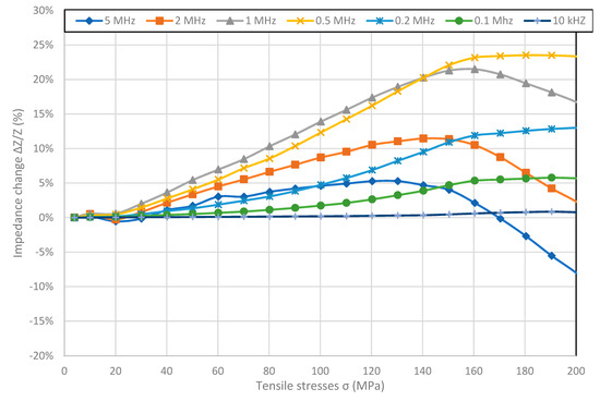 Figure 2 shows SI for Fe80B11Si9 ribbon with high magnetostriction saturation λs value. The max SI value equal to −29.07% was reported for 5 MHz frequency. For all of the frequencies the maximal value of Impedance Z is for the minimal stresses and graphs exhibit saturation for higher stress values. The value of stress for which the saturation of the SI effect is achieved, increases with frequency and was not reached for frequencies above 1 MHz.
