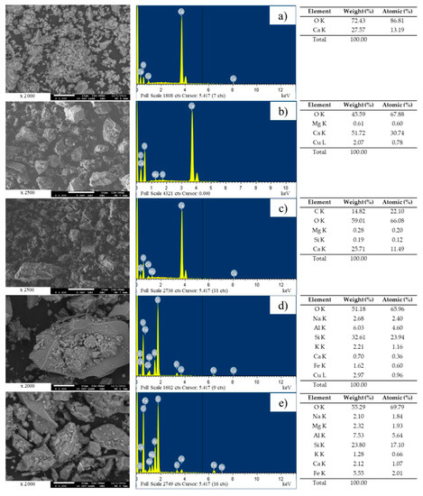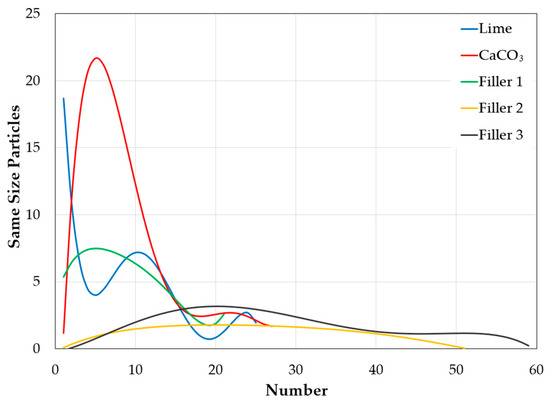 Figure 6 shows that the particles of the industrial-product fillers (lime and CaCO3) have rounded shapes (Figure 6a,b). Additionally, Figure 6c,d shows that the particles of Filler 1 and Filler 2 are cubic in shape, whereas Filler 3 tends to exhibit needle-like or laminar forms (Figure 6e).