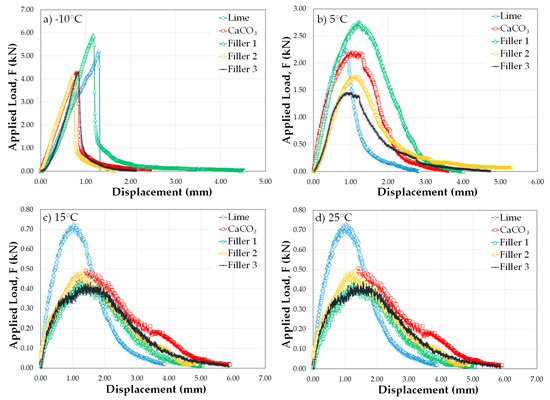 Semicircular bend load–displacement graph of all fillers at (a) −10 °C; (b) 5 °C; (c) 15 °C and (d) 25 °C.