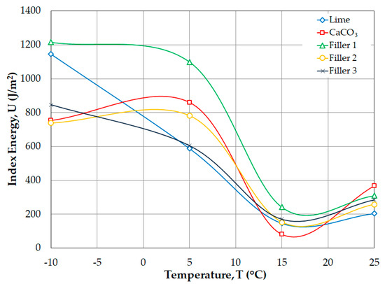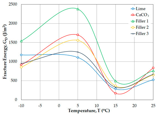 Additionally, the relationship between the temperature-energy index and fracture energy indicates that lower proportions of aluminum and silicon are associated with better performance; therefore, more energy is required to produce deformation and a fracture when Filler 1 is added to the SMA mixture. In contrast, the lime filler presents the worst performance with respect to the energy index and fracture energy.