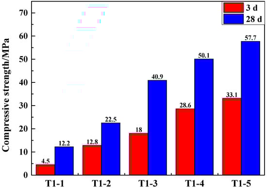 The compressive strength of samples with 100% cement and 100% slag on the 28th day reached 78.9 MPa and 2.2 MPa, respectively. Figure 1 showed that when the content of cement increases, the compressive strength increases continuously. This is because cement is a good gelling material [35] and has a good compressive strength after hardening. When the dosage of cement was 50%, the compressive strength of the GCM reached a maximum value of 57.7 MPa after 28 days of curing. When the dosage of cement was 20%, the compressive strength of the gelled material was 22.5 MPa on the 28th day, which would be close to the national standard of 32.5 MPa after chemical activation. Due to the high production cost of cement, chemical activators were added in the following experiments, which would also increase the strength of the GCM. In accordance with the principle of saving production cost and taking full use of smelting slag, T1-2 mixture ratio was adopted as the optimal experimental proportion for subsequent experiments.