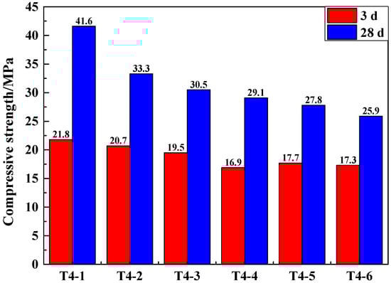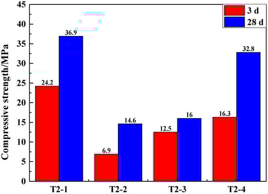 Tests for specimen strength were conducted on the 3rd and 28th days [33], and were recorded as T1-X. The ratio of SSCND to cement that meets the required strength was then selected. Different chemical activators were used to activate the SSCND–cement samples with this ratio. The strength of the samples on the 3rd and 28th days was measured, denoted as T2-X. The chemical activator with the best activation effect was then selected. Different amounts of chemical activator were used to activate smelting slag–cement samples, and the strength of the samples at the 3rd and 28th days was measured and denoted as T3-X, to determine the optimal amount of chemical activator. Desulphurization gypsum with different proportions was added to conduct composite activation of SSCND–cement samples with gypsum and chemical activator added, and the strength of the samples at the 3rd and 28th days was measured and recorded as T4-X.